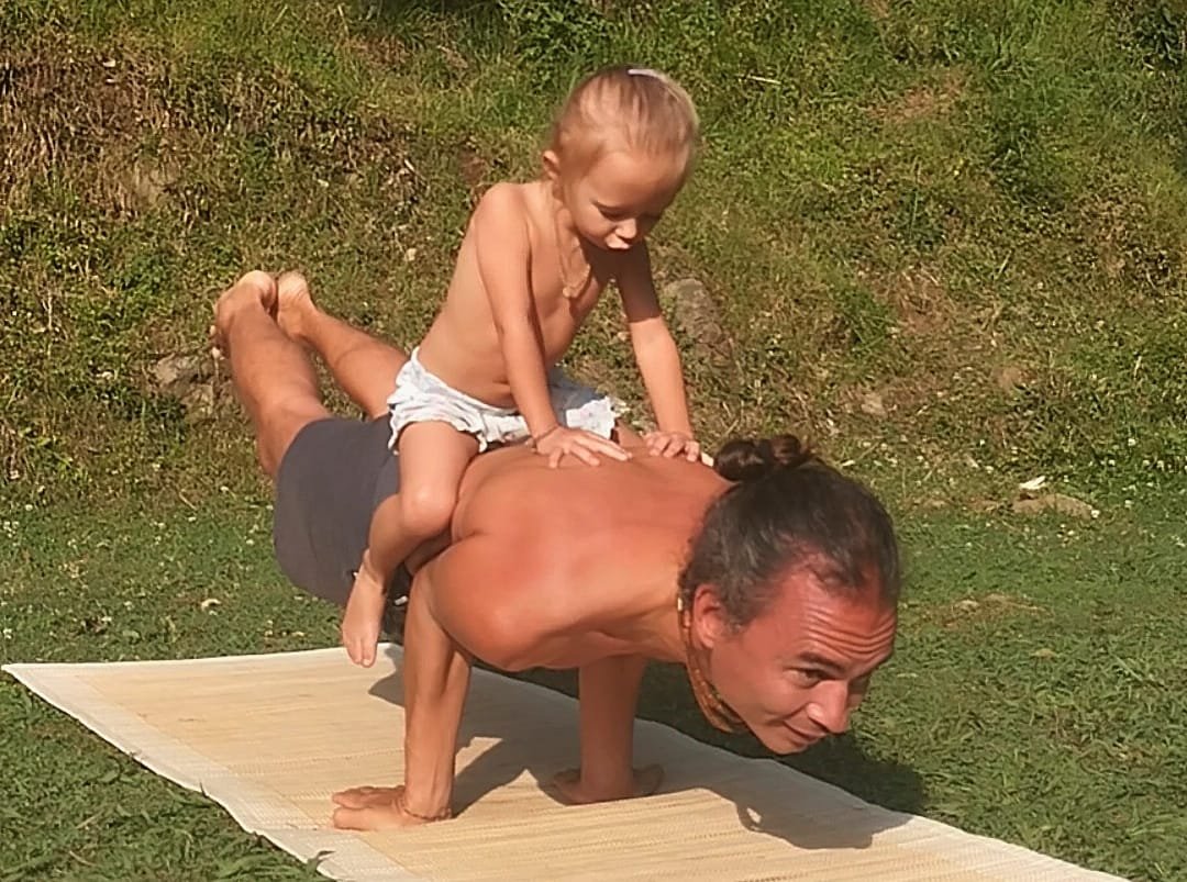 Don’t worry, we won’t start with this challenging peacock posture. This foto is just to show, that even if you have young kids around you, you can still take out time for Yoga. All asanas and practices in my curriculum have easy adaptations that can be followed by anyone.